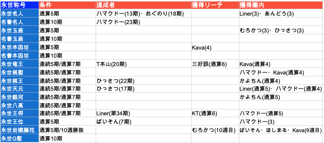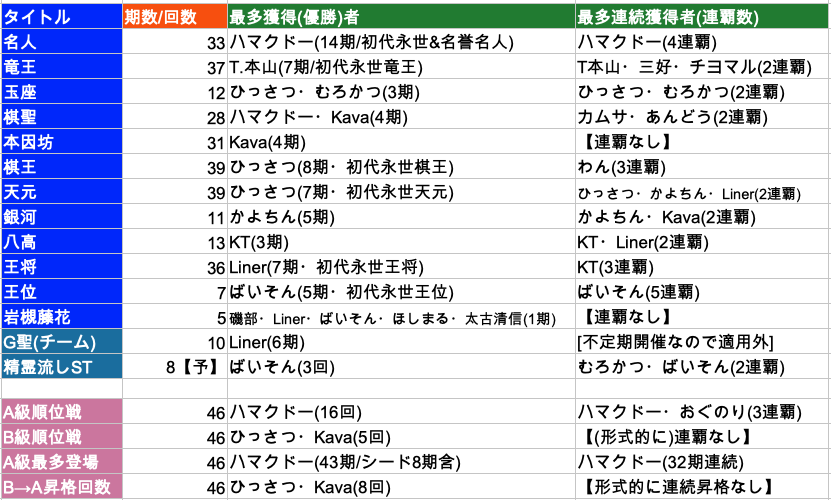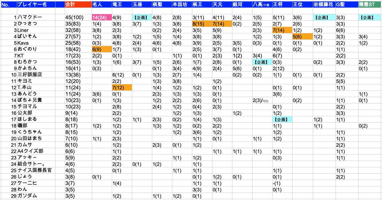 ※数字は「タイトル獲得数(括弧内は「2位入賞および前回のタイトルホルダーとして参加した回数」)」、橙色…永世タイトル獲得(桃色は名誉タイトル獲得)、水色…専担企画(プレイヤーとしての参加権は無し)