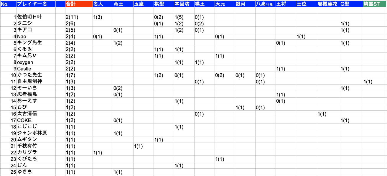…1期は決勝の1-2位。2期以後は現or新or前の名人・竜王か、決勝2位がカウントされる。恒例大型企画は企画優勝および2位がカウントされる。