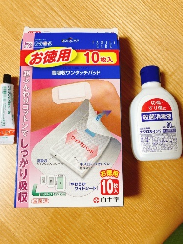 ↑左から処方してもらった抗生物質の塗り薬、市販の白十字の貼るガーゼ、マキロンによく似た消毒薬です。しみるー(ノД`)シクシク