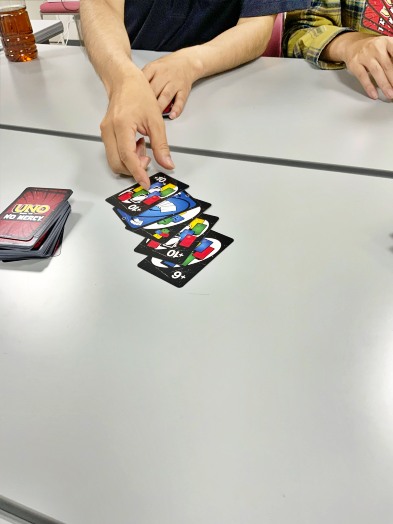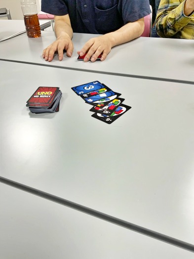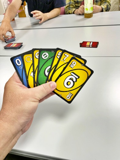 ↑私の手元にはこんなカードが。駐車禁止みたいな◯に斜め線が入ってるのはスキップ、左回りにぐるりと回転したマークがついてたのは自分以外スキップできる(つまり2ターン連続で出せる)カードで、7に左右が向いた矢印がついたのは誰かとカード交換できて(選択肢的には「しなくてもいい」そうです)、更に0は全員が隣の人と交換しなきゃならない…というなかなかのカード類でした。うーん、「5」や「9」の普通の数字カードが愛おしいぐらいに(^_^;)。