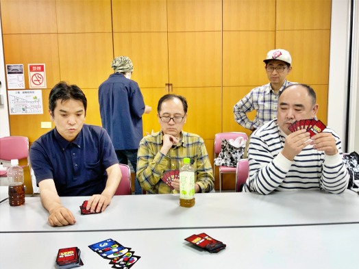余談としては、私・むろかつはギャラリー&ガヤ兼撮影係として各方向から少しずつ見てた上で「すげえなあ。まさに知略家だなあ」と見惚れるように感心しちゃったのが、キアロさんでした。彼もプレーを後ろから見てたんですが、仮にドロー4とかで複数枚喰らって10数枚を背負う事態になっても、実はドロー幾つかの反撃のカードも保有しててぶっちゃけここで更にドロー幾つかを出して隣のおぐのりさんやほしまる先生に簡単に振ることもできる中、あえてここでは攻撃系のカードを貯めてぐっと堪えて「いやいやここはまだ攻め時ではないぞ」的な感じでじっくり考えてた上で泰然自若としてたプレースタイルを見て「いやー、俺だったら速攻でドロー6とか出して隣の山田さんかハマさんに振っちゃうとこだけどな、すごいなーキアロさん」と勿論口には出しませんが物凄く印象に残ってましたです、はい。
