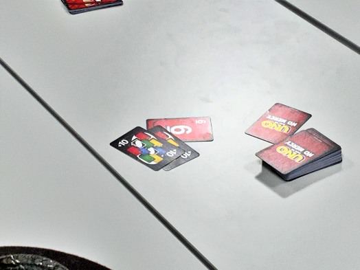 基本ルールは通常のUNOと同じで「前の人が出したカードの、色か数字が同じのが出せる」ってとこまでは同じなんですが、ドロー10まであったり、ドロー4の中にはリバースつまりはすぐ手前の人に4枚食らわせたり、更には「スタッキング」といって前の人が出されたドローの数字と同じ数字以上(例えばドロー4を出されたら、ドロー4・6・10)を出せば次の人にペナルティを回せる…といった「あちこちのローカルルールのUNOを全部乗せ」したような凄いルールになってました。