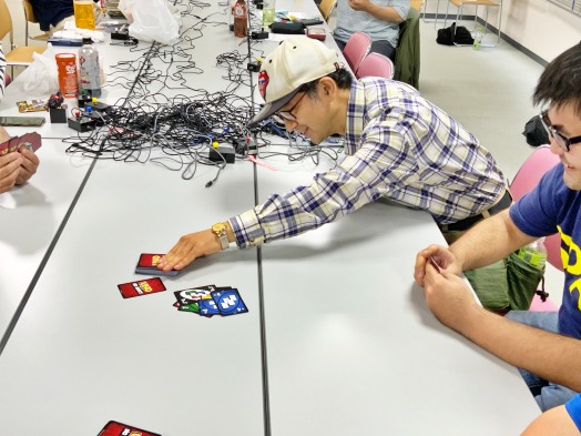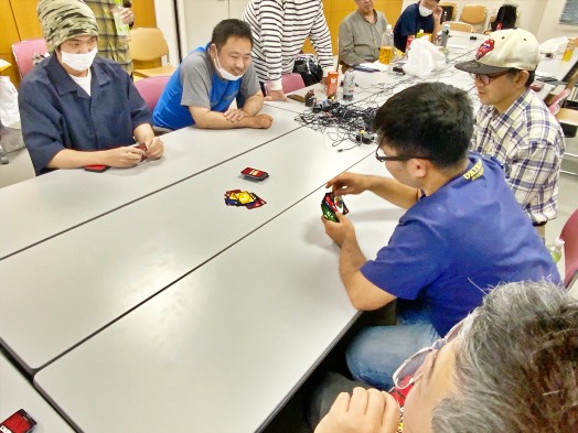 それと都度都度、プレイヤーが進行役のKavaさんに「これって出せますか?」「OKです/駄目です」とちょいちょい確認してから出すシーンも目立ってました。更にこのゲームは前の人が出したカードから手持ちのカードで出せない場合はは山から1枚取るんですが、通常のUNOだとそれで次の人にターンが回る一方でこの「ハンパねえ」の方は、出るまで延々と山からカードを引き続けるというそういう意味では「怖い」ルールもありました。なので私(むろかつ)なんかは隣の山田はまちさん、そしてハマクドーさんからにそれぞれドロー4を食らったんですが2回とも「まあ4枚だったらまだかわいいもんだ」とすいすいと4枚引いて次の人に回してましたし…というか「ま、いざとなったら0を出せばいいんだろ?0を出しゃ」とニヤニヤすらしてましたし(苦笑)。