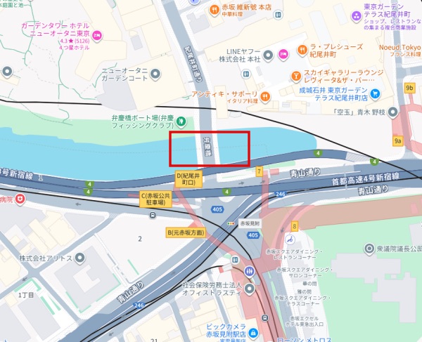 ↑地図で説明すると、ホテルニューオータニと赤坂見附の間に流れる堀(桜田濠、弁慶堀と呼ばれてます)にかかるえらい和風な橋でして、首都高速4号新宿線の新宿方面から首都高速に走ると、この弁慶橋の少し先のとこからトンネル(赤坂トンネル。このトンネル内に三宅坂ジャンクションというのがあります)に入るのですが、いつぞやここを運転してる時にとてもきれーな橋と、なんか釣り堀やボートみたいなのがちらっと見えて「なんか都心のど真ん中にのんびりした場所が…」とひとりごちしたのが作問したきっかけでもありました。なお逆方向、都心から新宿に向かう場合は全く見えないので念の為。