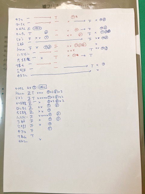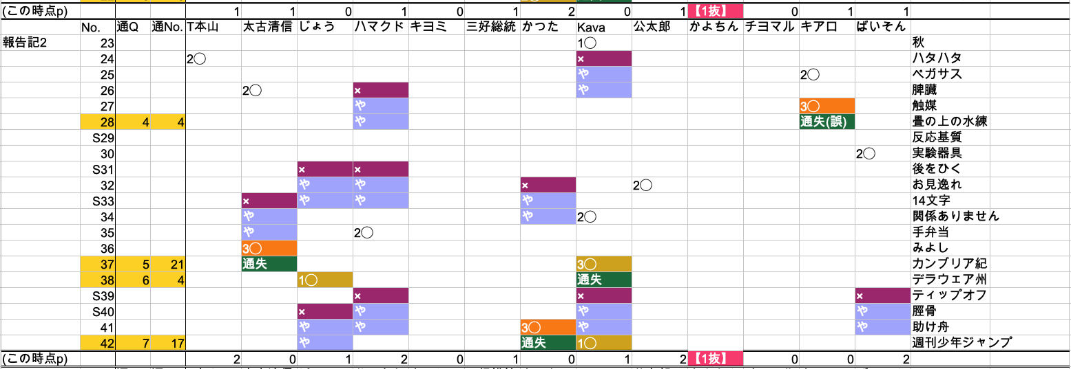 で、今回は「通過クイズ」というルール柄、例えばこの日の例会で言えばむろかつの八高戦(8◯5×)や、ばいそんさんフリバ企画(7◯3×)と違い、3◯で通過クイズに挑戦し、もし失敗したら0◯に戻る…というポイントの変動がいつもよりかなり激しい企画でしたので、いつものようにVTRチェックしながら記事を書きつつ、各人の「正解数・誤答数・通過クイズ挑戦回数・通過クイズ阻止回数」も紙に書きながらやっておりました。