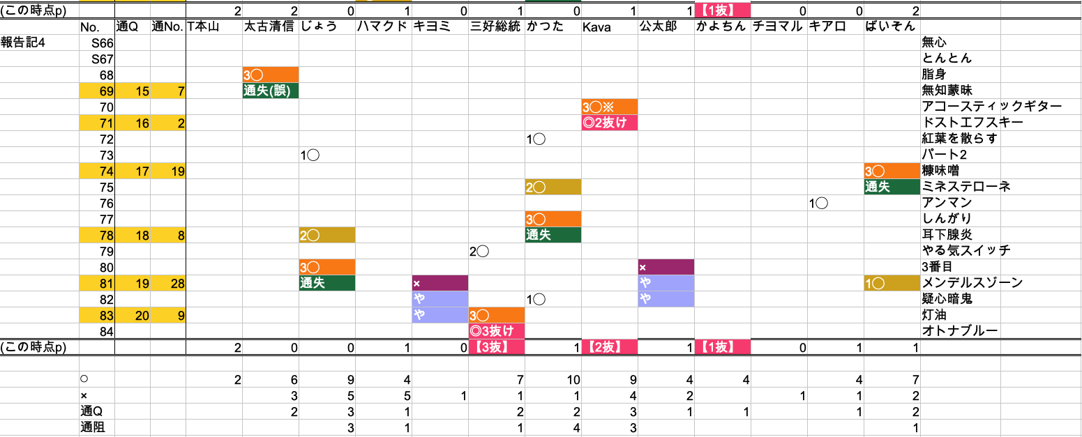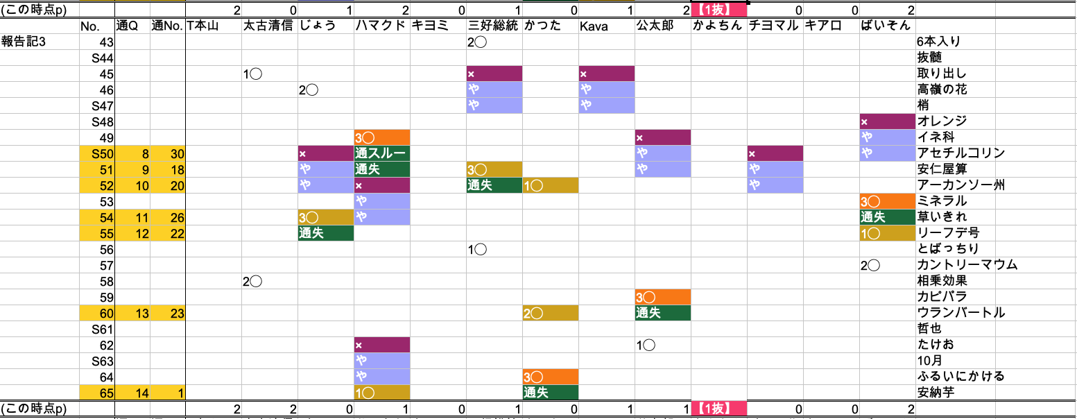 ま、岩Q槻の慣例としては「当日の例会の記録と、後日VTRチェックした記録がズレている場合は、当日の方を優先とする」というのがありますので、Kavaさんの2抜けは公式記録として変わらないのは言うまでもないのですが、もしかしたら他にも誤差があるかもしれないと思いまして、急遽、表計算ソフトで一覧表を作ってみました。それと当時にその1-3までの記事の文末にも以下の得点表を追記で掲載いたしました。
