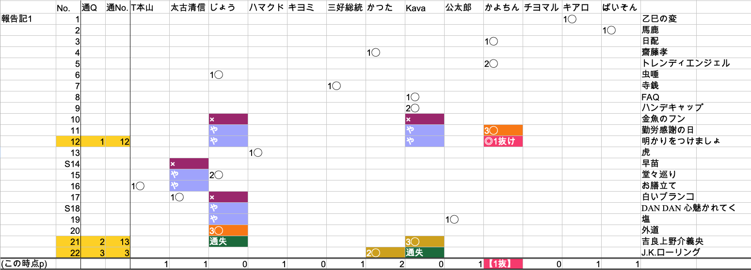 かよちん4◯(1抜け、通Q1)、Kava7◯4×(通Q2、通阻3)、かつた先生6◯1×(通Q2、通阻3)、じょう6◯5×(通Q2、通阻2)、