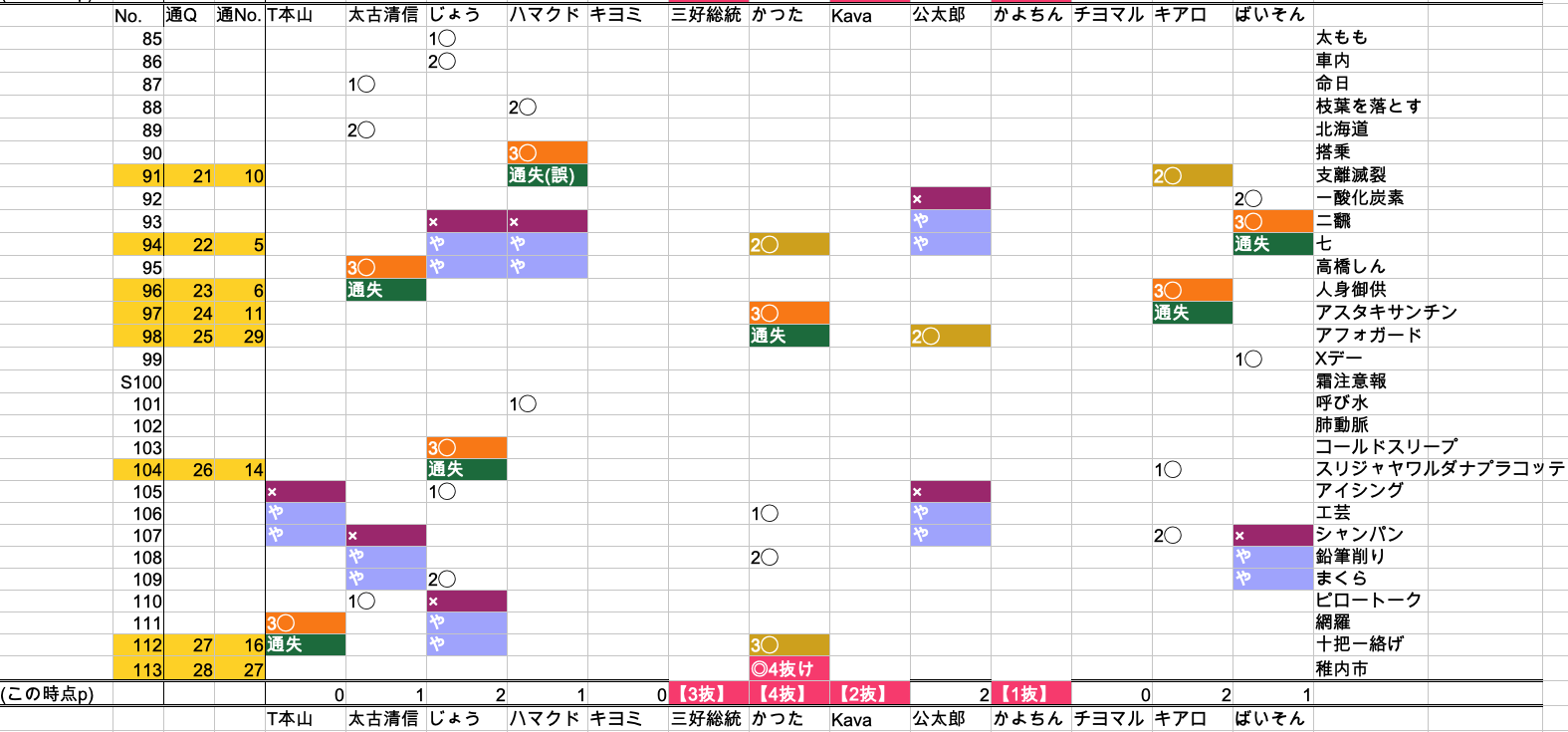 Q107「ピンク・ゴールド・ホワイトの前に来るお酒→シャンパン」は、ばいそんさんが「ドンペリ」、太古先生が「カクテル」で誤答となった後にキアロさんが「シャンパン」で正解して2◯に。ばいそんさんも太古先生もお酒を飲む方な人でしかも思えば近い答えだったのがやはり惜しい(^_^;)。続くQ108は「英語ではシャープナーと呼ばれている文房具→鉛筆削り」をかつた先生が正解してこれまた2◯まで伸ばして、更にQ109では「落語のネタに入る前の小咄→まくら」をじょうさんが正解してこれまた2◯として通過クイズリーチをかける人が立て続けに揃う展開に。