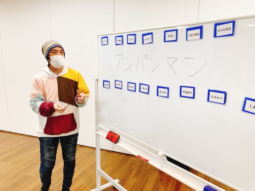 ↑キアロさんがルール説明もボードに書いてやっておりました。例えば答えが「アンパンマン」だと問読みの際には「アパマン」になります…と。説明を聞いてたプレイヤーの皆さんも「これはおもしろい」「よくこういうアイデアが思いつくねえ。すごいわー」「ひらめきも結構重要なクイズ企画だねー」と一様にびっくりしておりました。あと「下手したらボケ回答が正解になりそう」と言ってた人も(苦笑)。