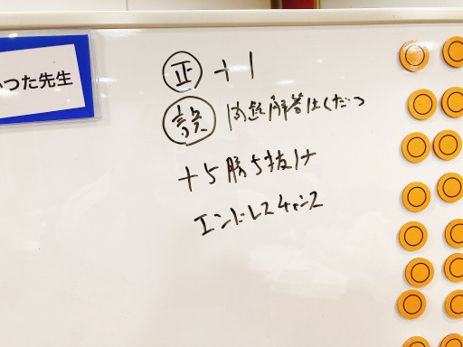 で、ここではひとまずメモ用に配布されたボード(いつも岩Q槻の備品として用意しているクリアファイルの中に白紙が入ったもので、こちらの表面に文字を書いたりイレイサーで消したりして使用してます)にこの「コウシンケ」の文字を書いてみて少し考えてみるプレイヤーの皆さんでした。すると少しして押したのは公太郎さんで「平方四辺形」と答えて正解チャイムが鳴り1◯になってました。で、三好総統が文字面から(?)「また健康診断が」とつぶやいてたのはやはり不惑の40-50代を迎えた皆さんが多いクイズサークルゆえか(をい)