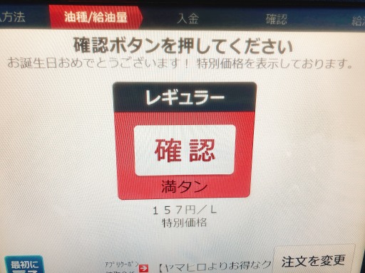 ↑通常がリッター165円だったので誕生月割引込で8円引きだったようです(笑)。ま、いつもは会員割引で4-5円引きぐらいしてもらってるんですが、それでもありがたいですね、はい。給油する直前の車のガソリンの残りが下から4メモリぐらい、残り距離で140キロぐらいになってましたが31リットルほど給油できましてかなり満タンに近いとこまでメモリが戻ってたのは幸いでした(^_^;)。