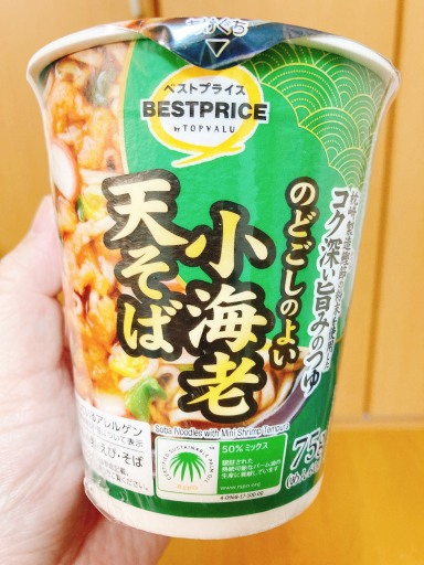 イオンのPB商品の「小海老天そば」です。最近はお昼にそばを食べなくなりまして(逆にうどんは多いんですけどね)、じゃあ明日のお昼は家で作っていくおにぎりと、このカップそばにしようと決めました。なおこちらは108円でした、やすいっ(笑)