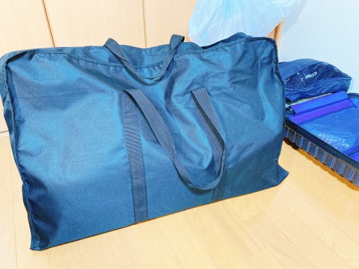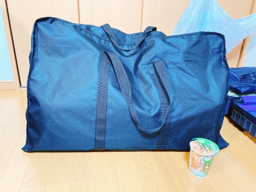 そしてこのお菓子類を大きな3つのレジ袋に分けまして、早押し機本体セットと共に巨大なトートバッグのようなスポーツバッグにしまいました。このバッグ、どんぐらい大きいのかといいますと、