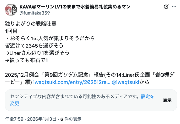 こんにちわ、番頭役のむろかつでございます。2025/12月例会「第9回ガソダム記念」の報告記の続きです。時間が多少余ったという事でLinerさんが突発的に開催してくださった「岩Q槻ダービー」という企画でした。しかしこの企画、岩Q槻企画史上・過去最短時間記録を更新した企画にもなりまして(苦笑)。