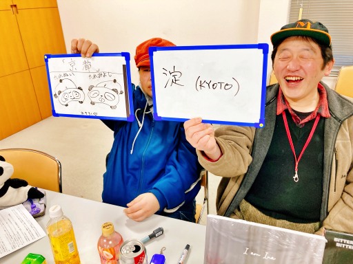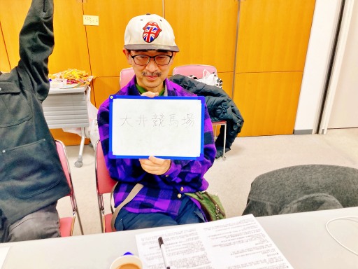 更に続いてのキヨミさんは「京都競馬場」をパンダに模したひよしコンビの似顔絵つきで(笑)。そしたら隣のダンナである三好総統が「淀→京都競馬場」と書いててこれまた2人かぶり…と、夫婦の仲の良さを見せつける始末(苦笑)。なお「淀」というのは京都競馬場があるあたりの地名で、最寄り駅も京阪本線の淀駅から連絡通路ですぐという位置にあります。