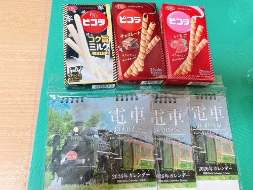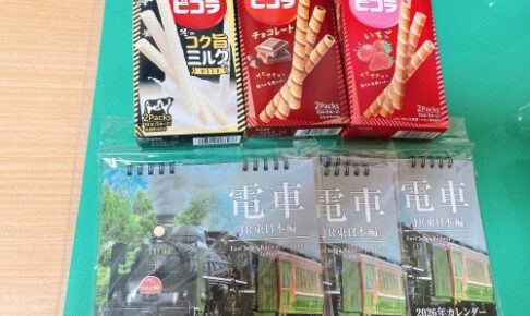 ↑午後分はとりあえず3つほど、あきる野市のダイソーで108円のお菓子と、たまたまレジ横で売っていたJR東日本編の電車カレンダーを購入してきまして、午後3企画分の優勝賞品とすることにしました。なお午後4枠まで行ってしまった場合は後日、別の賞品を贈呈させて頂く予定です。