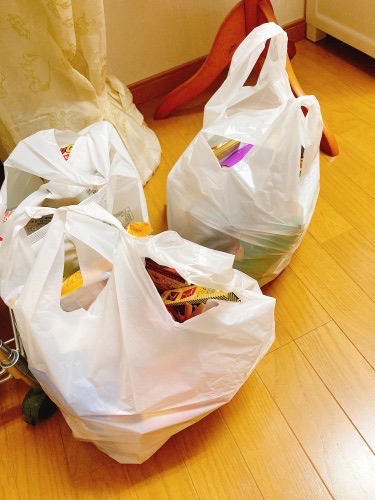 で、いつも大量の差し入れお菓子や、私自身当日昼に食べるカップそばなども購入してきまして、3袋ほどに分けました。このビニール袋が、帰りには燃やせるゴミ2袋、ペットボトル等のゴミ袋に化けるわけですが…(笑)。