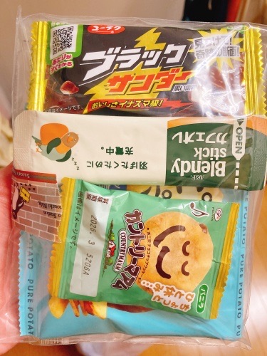 ↑こういうお菓子やカフェオレスティック、裏にはホッカイロみたいなのも入っております。