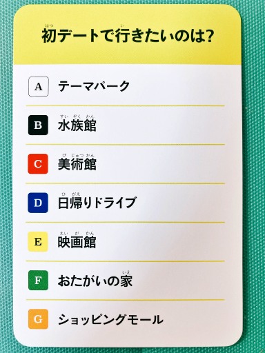 [選択肢]A:テーマパーク、B:水族館、C:美術館、D:日帰りドライブ、E:映画館、F:おたがいの家、G:ショッピングモール