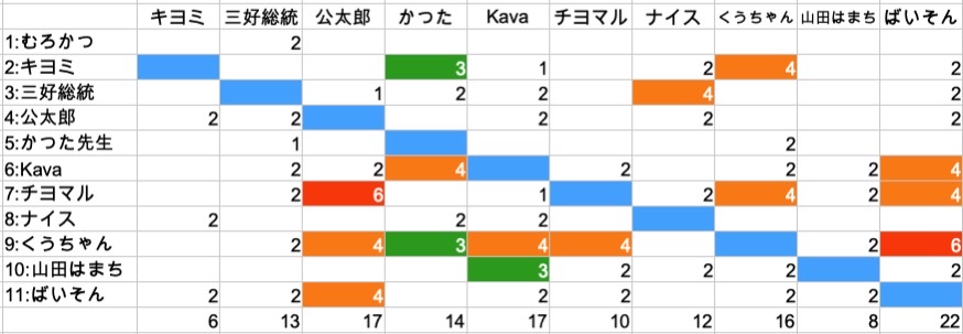 チヨマル+44p、Kava+32p、キヨミ+27p、公太郎+18p、三好総統+16p、かつた先生+4p、(参考:むろかつ+4p)