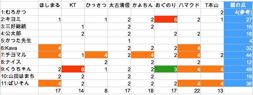 くうちゃん+49p、チヨマル+44p、ばいそん+36p、Kava+32p、キヨミ+27p、山田はまち+19p、公太郎+18p