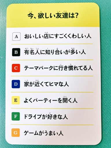 D:家が近くてヒマな人、E:よくパーティを開く人、F:ドライブが好きな人、G:ゲームが上手い人