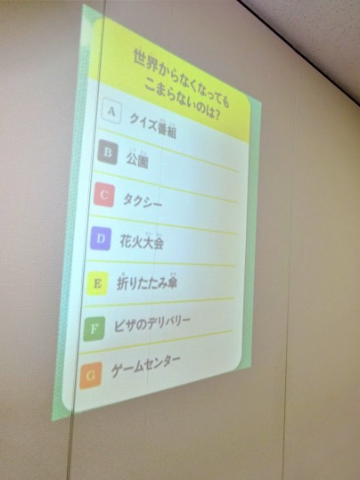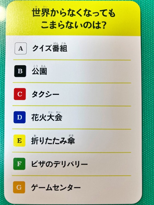[選択肢]A:クイズ番組、B:公園、C:タクシー、D:花火大会、E:折りたたみ傘、F:ピザのデリバリー、G:ゲームセンター
