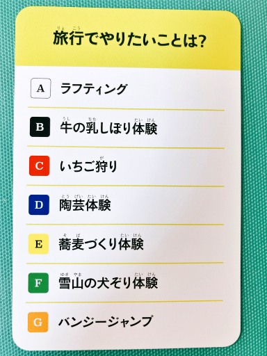 [選択肢]A:ラフティング、B:牛の乳しぼり体験、C:いちご狩り、D:陶芸体験、