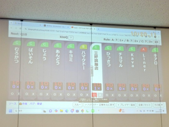 そしてQ14は2択の鉄道問題。「宮本武蔵駅(岡山県にあるそうです)」を正解したばいそんさんが2◯とすると、Q15「前沢牛→岩手県」もばいそんさんが正解し連取に成功して3◯として一歩リードしたところで前半戦から中盤戦に入っていくとこになっていきました。