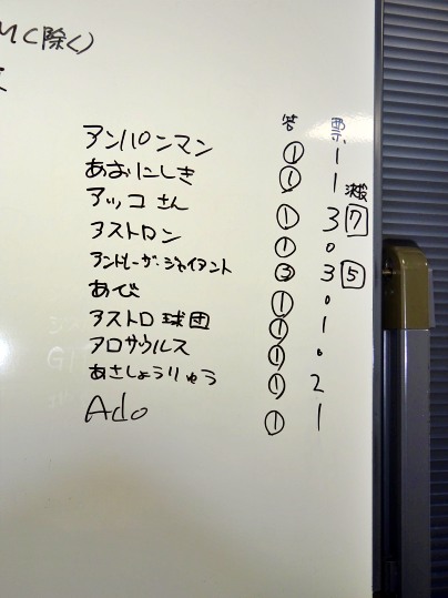 で、7人目はひっさつ会長で「アストロ球団」という週刊少年ジャンプに連載されていた人気漫画を。まあこの漫画、野球の試合中に死亡者が平気で出るという凄まじい漫画でして(大汗)。そして8人目のハマさんは肉食恐竜の「アロサウルス」、ラストの三好総統は「Ado」という人気女性歌手を。しかし「Ado」と聞いてほしまる先生が「昔、似顔絵描きで一斉を風靡した」とボケてむろかつ他が「それは水森亜土じゃ」とツッコミを入れるのもまさにその世代だなーと(爆)