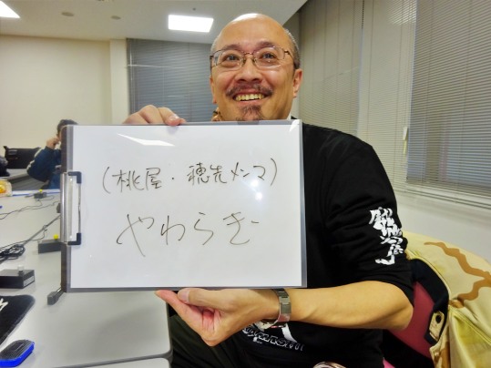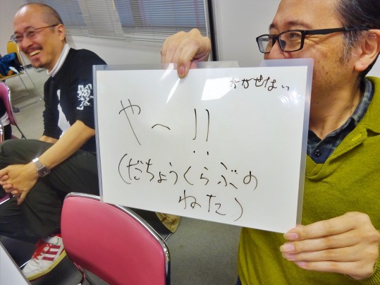 そして後半戦。チヨマル先生は「屋根」と。そしたら笑点の林家木久扇師匠のネタ「やーねー」があちこちから飛び交う困ったことに(爆)。7人目のむろかつは先述のとおり「おかわり自由のやよい軒」と回答したらやはりウケてまして、それがいい呼び水となったか、8人目のキヨミさんは「芸人のボケとツッコミには書かせません→ヤーッ!!」というダチョウ倶楽部のネタ的なそれを回答したところ、
