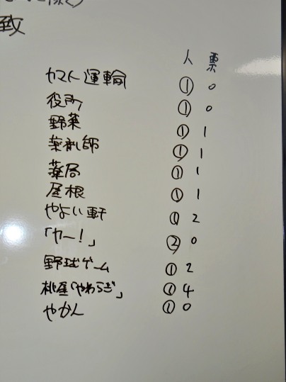 4)回答が全部出た時点でプレイヤーの挙手で最も票数を獲得した回答が「正解」となる(なお自分で自分のに投票はできない)。