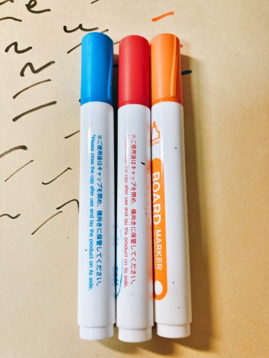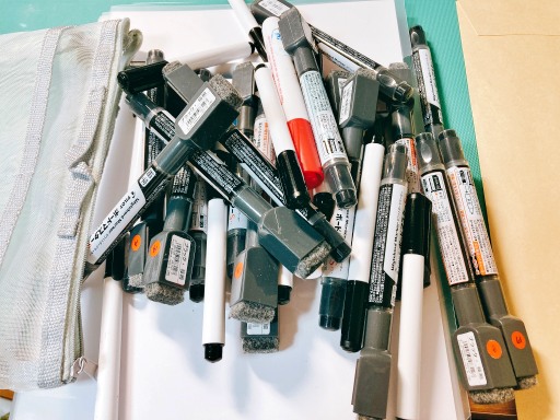 こうして一本一本、インクが薄れてないかどうかをチェックして、薄すぎて書けないのはここで処分するようにしてます(で、だいたい30本ぐらいをキープできるように、後日、不足分をまたダイソーに買いに行くことになります)。そのKICKSのぽちょさんからいただいたイレイサー付きのボードペンが結構丈夫で、もう2年ぐらい使ってますがなかなかインクが切れないのでありがたい次第です(笑)