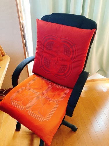 で、パソコンチェアの方は背もたれの部分は我が家の来客用の古いざぶとんを貰い受けましてそれを暫定的に置いてます。たぶん前傾姿勢でPCに向かっているのでそれほどヘタることはこれまたないとは思いますけどね…。