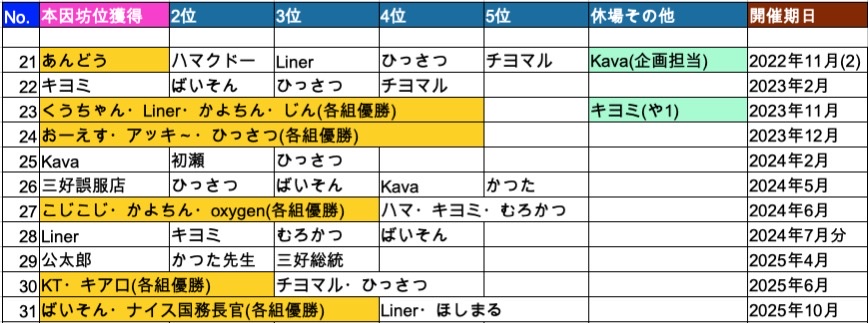 ※2 第24期は各組対決の優勝者が全員正規タイトルホルダーになりましたが、おーえすさん・アッキ~さんが休場、ひっさつ会長が4位…とバラバラの結果になったため、データ管理が煩雑になるので便宜的に「統一戦」ということで正規タイトルホルダーが交代となりました。